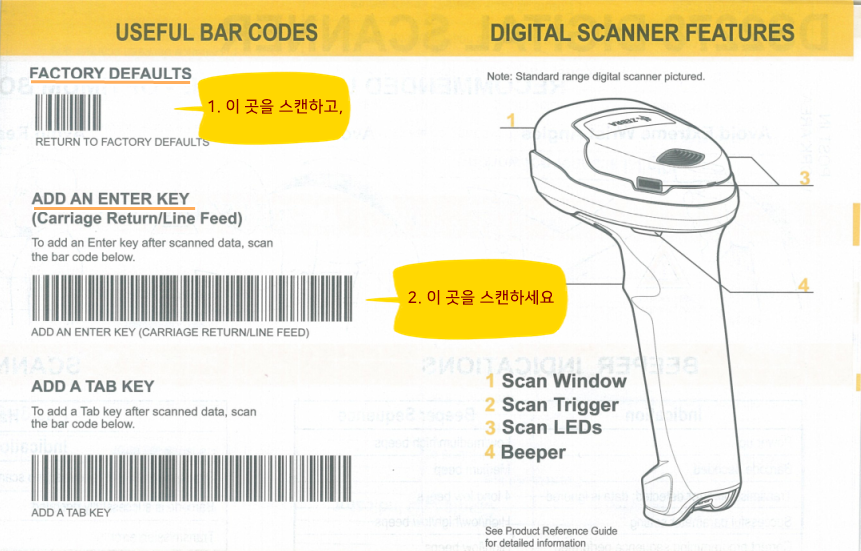 스캐너 구입 시 동봉된 매뉴얼에서 위의 순서대로 2 곳의 바코드를 스캔해주면 끝입니다.