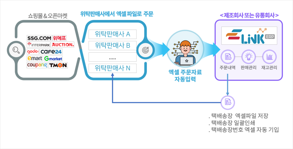 링크ERP에서는 쇼핑몰 위탁판매의 모든 과정을 엑셀을 통하여 자동 처리 합니다.