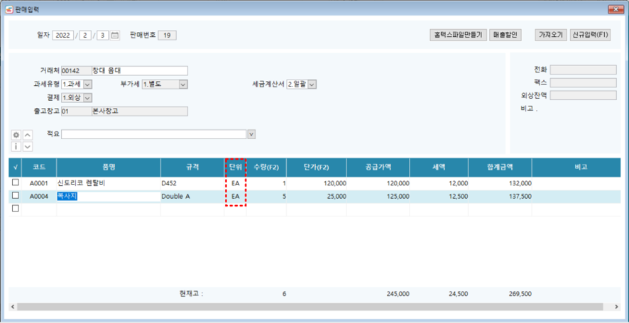 판매입력 등 모든 화면에서 품목 선택 하면, '단위' 가 표시됩니다.