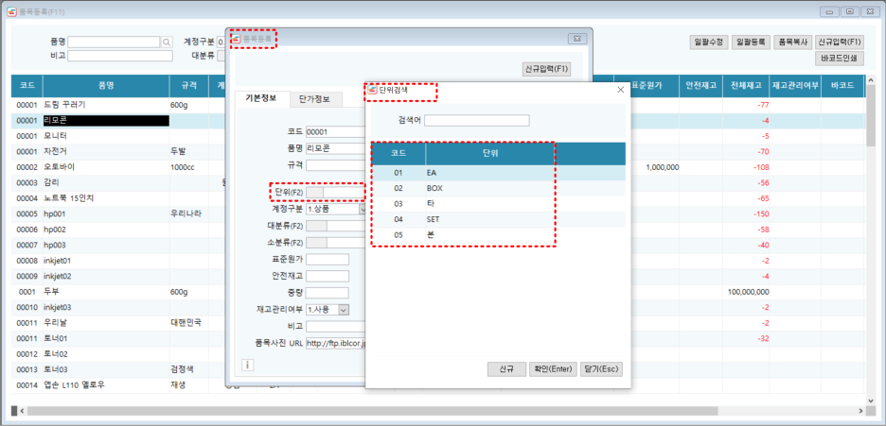 품목등록화면에서 아래와 같이 '단위(F2)' 선택 시, 등록한 단위가 사용됩니다.