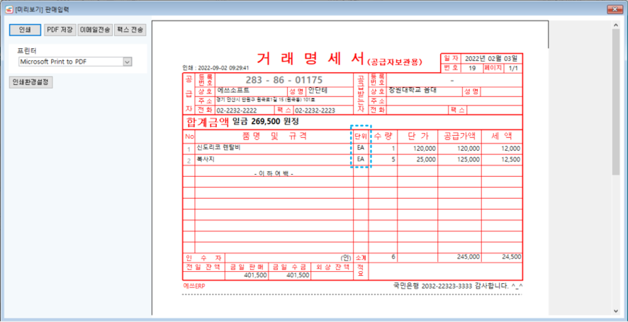 아래와 같이 거래명세서에서도 단위가 표시됩니다.