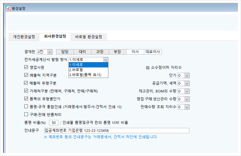 | 결재란 | 모든 인쇄물 상단의 결재란 표시할 경우, 결재방의 개수를 선택함 : 2개 ~ 6개 |
