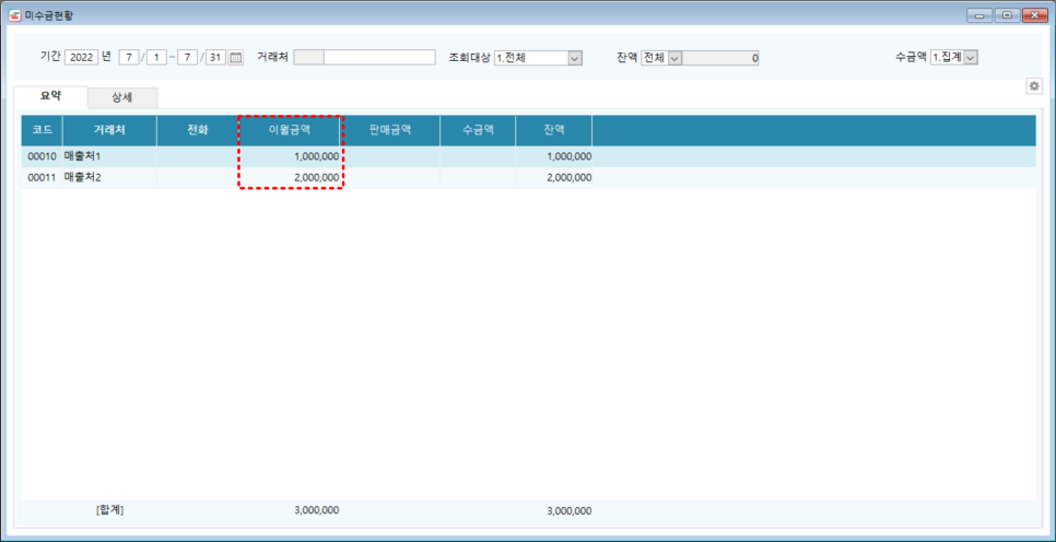 #미수금현황 을 조회하면 위의 그림과 같이 #외상이월잔액 에서 입력한 금액이 [이월금액] 란에 조회되는 것을 확인할 수 있습니다.