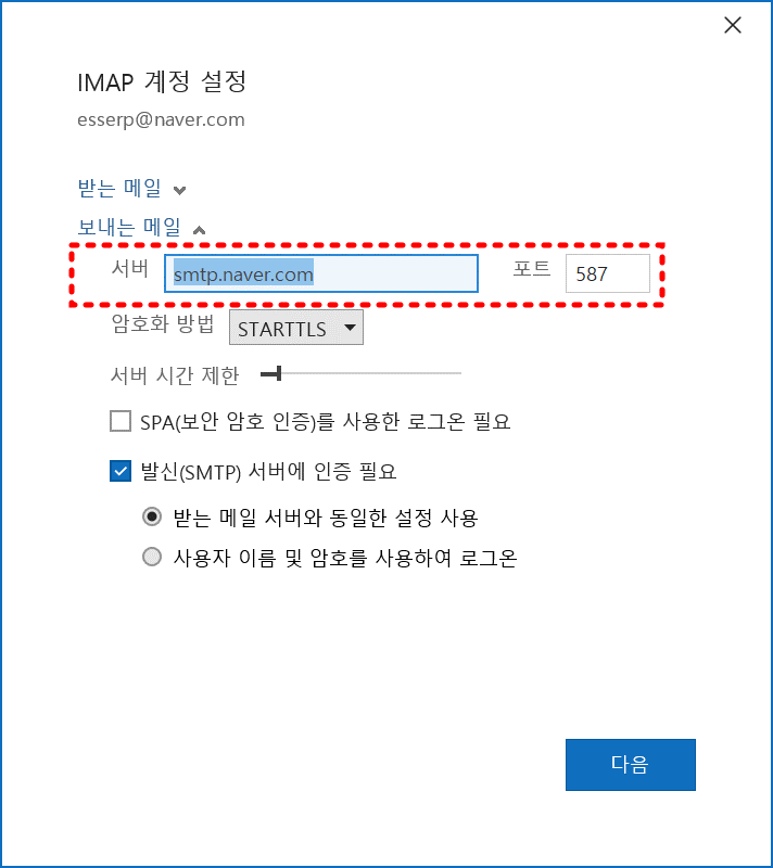 2. 보내는 메일서버 설정 : smtp 서버 주소와 포트번호 입력합니다.