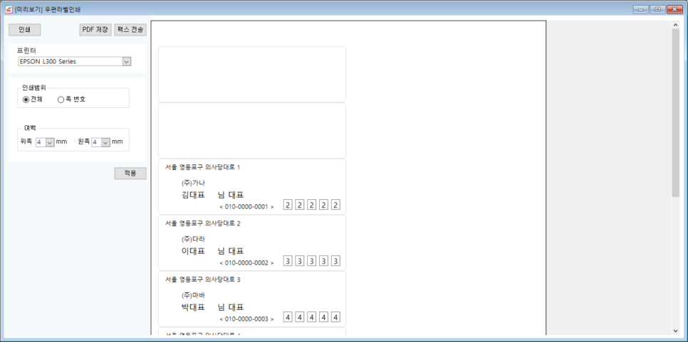 인쇄버튼을 누르면 위와같이 [#우편라벨인쇄]설정 화면이 나타납니다.