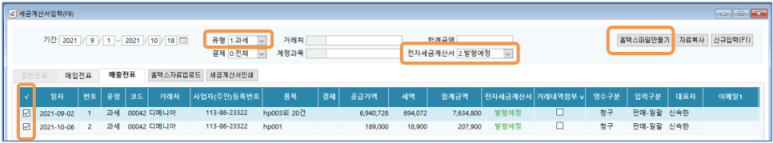 2. #전자세금계산서 : [2.발행예정]을 선택하면 [홈택스파일만들기] 버튼의 기능이 활성화 됨
