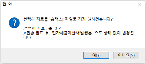 5. 선택한 자료들이 엑셀파일로 저장되고, 이 화면의 리스트에서 사라짐. 저장이 완료되면 ‘전자세금계산서’ 상태 구분이 ‘발행분’ 으로 변경됨
