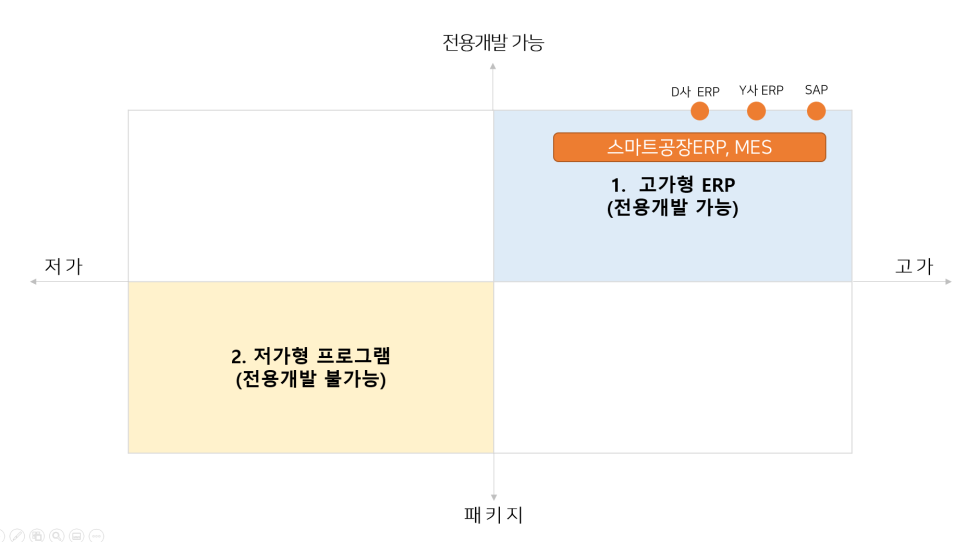 | 1.#고가형ERP시장 | .외산ERP, 국내의 Y사, D사 등이 유명함 .도입 금액이 고가임 .최근 MES 등 스마트공장지원사업도 이 시장의 일부로 볼 가능성도 있음 .#전용개발(커스터마이징)이 가능하나비용이 기하급수적으로 올라감 .도입 실패 시 경제적인 위험부담이 큼 |