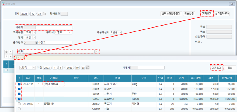 판매입력 화면에서 [가져오기] 를 클릭하면 견적서를 복사할 수 있습니다.