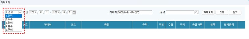 판매입력 화면에서는 견적 뿐 아니라 수주, 판매, 구매자료까지 가져오기(복사)할 수 있습니다.