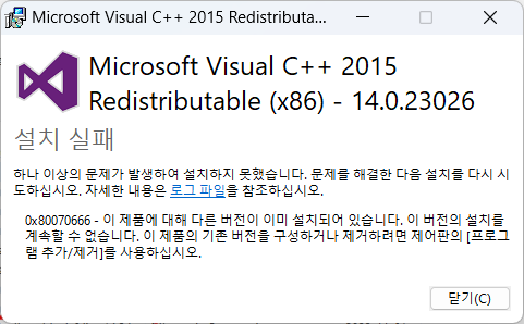 설치하고자 하는 PC에 이 보다 높은 버전의 Vicusal C++ 이 있으면 모두 제거해야 합니다.