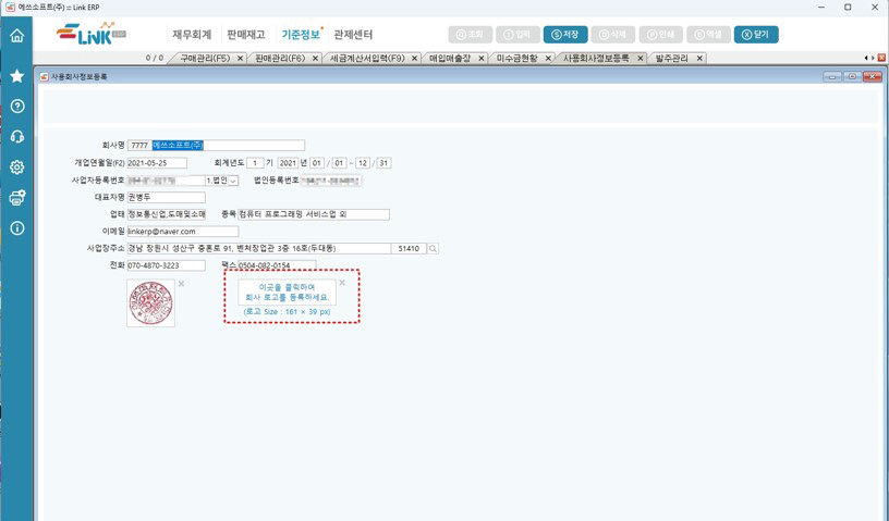 LinkERP가 처음 등록되었을 때 [사용회사정보등록] 화면의 회사로고 등록란은 비어 있습니다.