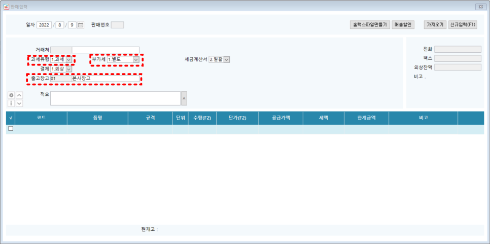 과세유형이 항상 과세이고, 부가세는 별도이고, 결제는 외상이고, 출고창고는 본사창고라면은요~