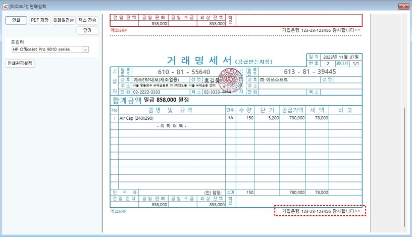 위의 그럼 처럼, 거래명세서 하단에 은행명과 계좌번호, 안내문구 등을 항상 인쇄할 수 있습니다.