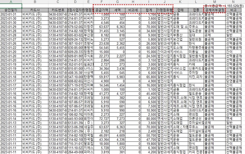 일반 카드사에서 엑셀로 다운 받은 내용은 매입세액 공제여부가 표시되지 않아 사용할 수 없습니다.