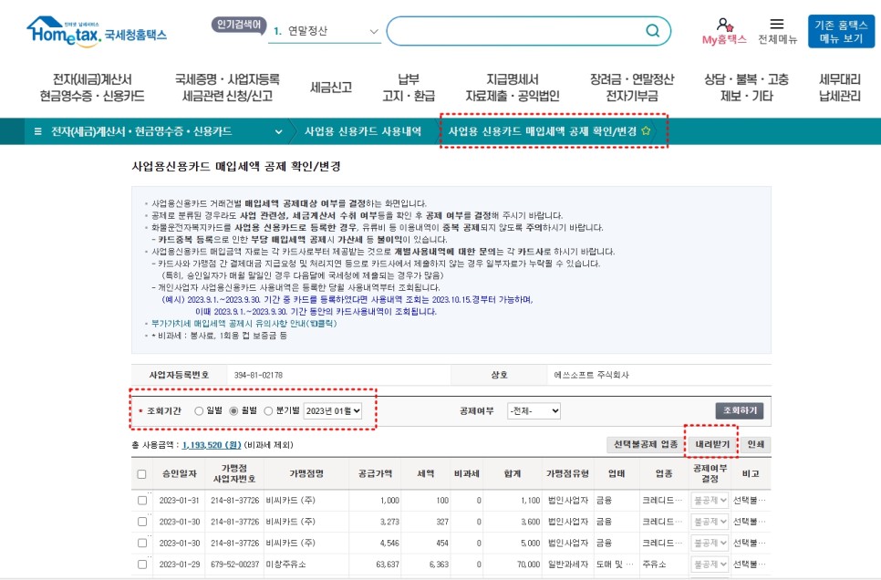 홈택스의 사업용신용카드-매입세액공제 확인/변경 화면을 이용하는 방법