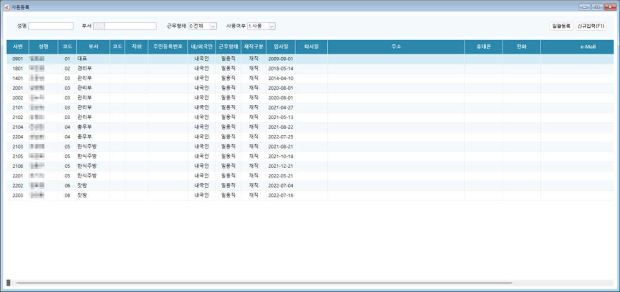 위 그림의 2번째 줄에 코드가 없는 경우는 사원등록 화면에 해당 성명이 없는 경우입니다.
