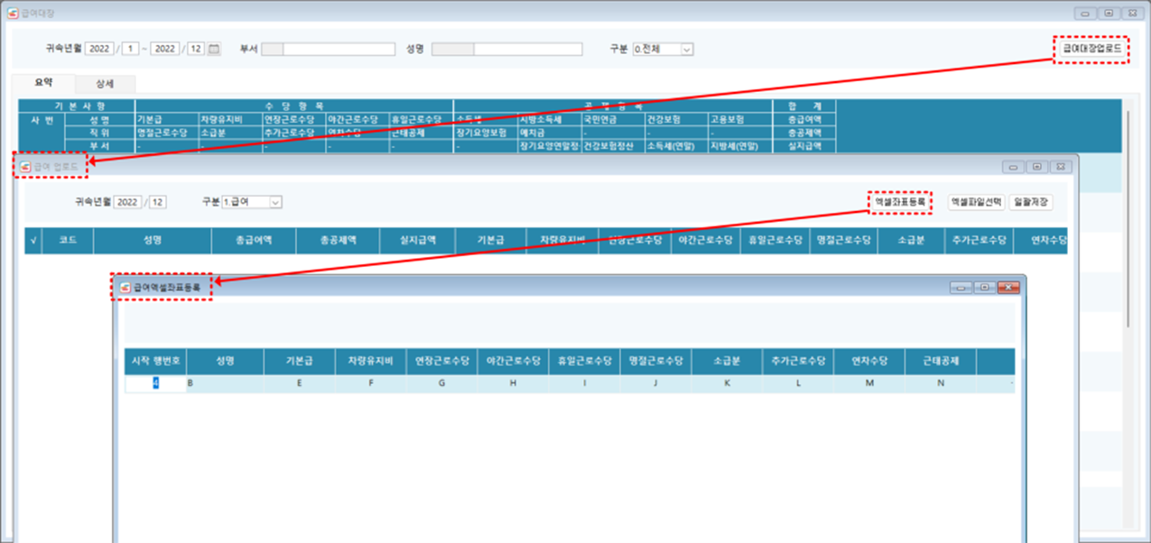 그러므로 급여대장 파일에 등장하는 사원의 성명은 정확하게 사원등록 화면에 존재해야 합니다.