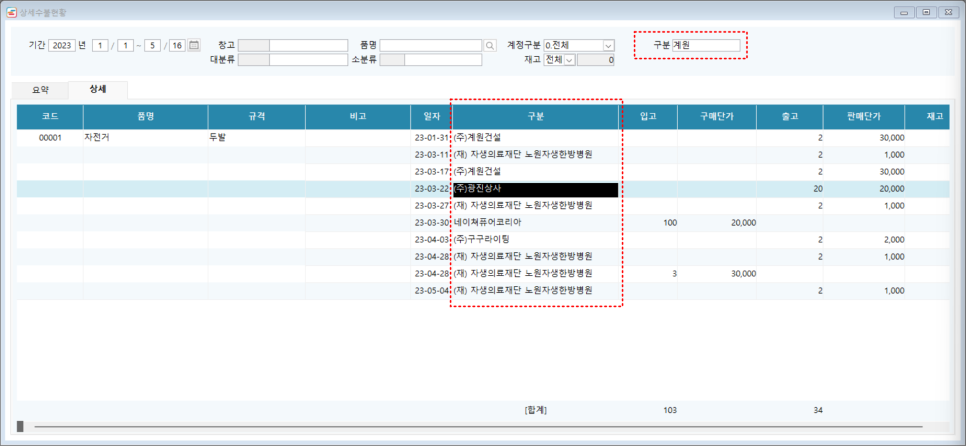 상세 탭에서 '구분'에는 입고의 경우 구매처, 출고의 경우 판매처가 조회됩니다.